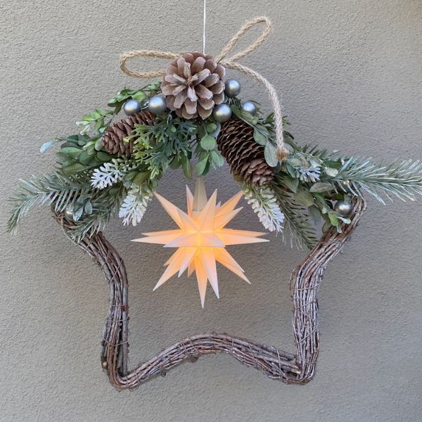 Der kleine Original Herrnhuter Stern mit weißen Spitzen hat einen Durchmesser von ca. 13 cm und ist ausschließlich für den Innenbereich vorgesehen. Der Mini-Stern befindet sich in einem Dekokranz. Dieser ist mit Naturmaterialien dekoriert - die Weide ist gekalkt.